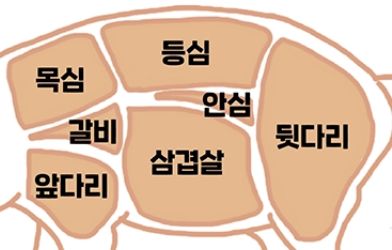돼지고기를 크게 여러부위로 나눠보면 안심, 목심, 등심, 앞다리, 뒷다리, 삼겹살, 갈비로 나눠볼 수 있습니다. 이걸 다시 작은 부위로 나눠보면 안심은 안심살, 목심은 목심살, 등심은 등심살, 알등심살, 등심덧살로 나눌 수 있습니다. 앞다리는 앞다리살, 앞살태살, 항정살로 나눠지고 뒷다리살은 볼기살, 설깃살, 도가니살, 홍두깨살, 보섭살, 뒷사태살이 있고 삼겹살에는 삼겹살, 갈매기살, 등갈비살, 토시살, 오돌삼겹살로 나눠지고 마지막으로 갈비는 갈비, 갈비살, 마구리로 나눌 수 있습니다. 나름 고기를 많이 먹어봤다고 생각했는데 이렇게 많은 부위가 있는 줄을 몰랐습니다. 처음 들어보는 부위도 있고 자주 먹은 부위들도 있습니다. 삼겹살은 살과 지방이 섞여있어 많이 퍽퍽하지 않고 기름지며 맛있습니다. 안심은 등심과 비교해서 지방이 적은 편이며 주로 돈까스, 탕수육에 사용됩니다. 등심인 돼지고기 중 가장 연한 부위로 스테이크로 주로 사용됩니다. 앞다리와 뒷다리살은 지방이 적고 수육, 보쌈으로 먹습니다. 갈비는 갈비찜, 갈비구이로 먹으며 감칠맛이 있는 것이 특징입니다. 갈매기살은 힘살이 많이 씹는 맛이 있고 쫄깃합니다. 주로 구이로 사용해서 먹습니다. 목살은 지방층과 근육들이 있어 육질이 부드럽고 소금구이, 보쌈으로 먹습니다.