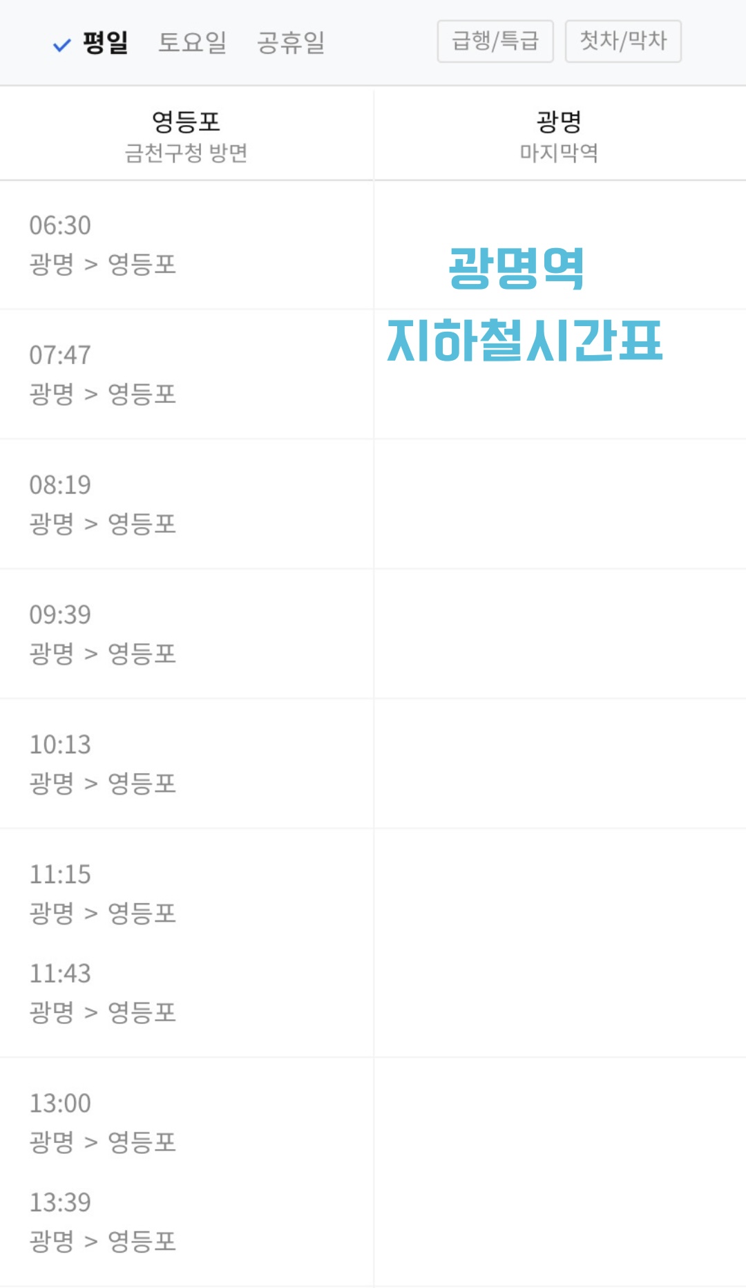 광명역에서 평일 열차시간에 대해서 설명해드리겠습니다. 첫차는 6시반에 있고 막차는 23시 37분에 있습니다. 운행하는 시간이 많지는 않아서 확인하고 가는 것이 좋습니다. 첫차부터 막차까지 시간을 쭉 나열해보겠습니다. 6시 30분, 7시 47분, 8시 19분, 9시 39분, 10시 13분, 11시 15분, 11시 43분, 13시, 13시 39분, 14시 28분, 15시 15분, 16시 2분, 17시 17분, 18시 22분, 19시 34분, 20시 10분, 21시 20분, 21시 58분, 22시 43분, 23시 37분까지 20개의 지하철 시간표가 있습니다.