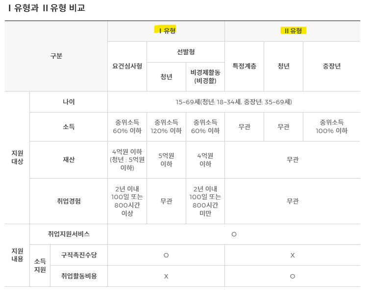 소득, 재산 등 소유하고 있는 정도에 따라서 두 가지 유형으로 나누어 지원해주게 됩니다. 두 유형 모두 취업 지원서비스를 받을 수 있습니다. 아래에서는 차이점에 관해서 설명해보도록 하겠습니다.